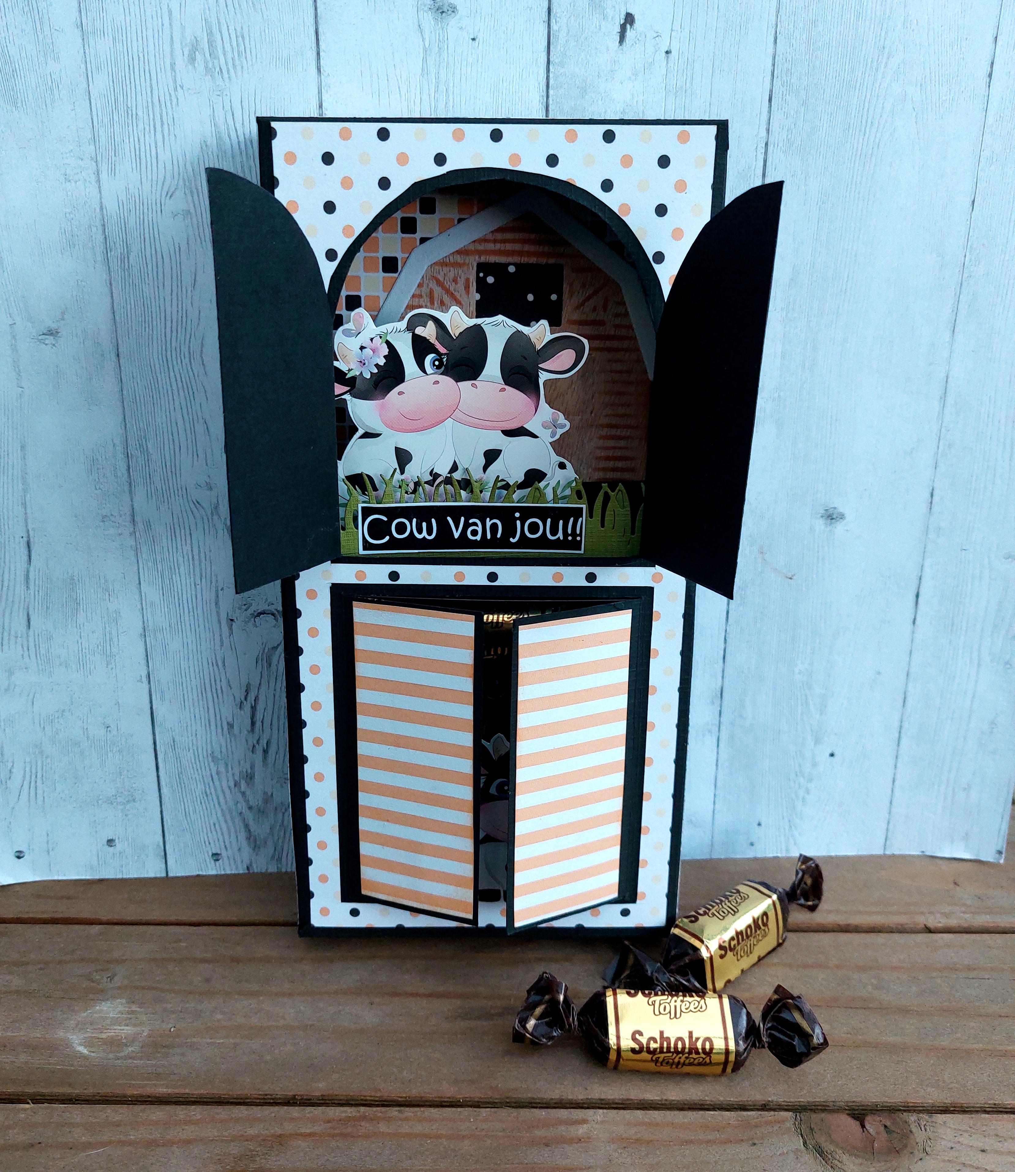 Het tekstje printte ik zelf. Ik had een heel vel met toepasselijke koeien-tekstjes geprint en daarvan heb je er al een aantal voorbij zien komen. Binnenkort zijn er 2 mentorleerlingen en de dochter van vrienden jarig, dan zie je er nog een aantal. Morgen ga ik op de hartjes-toer....